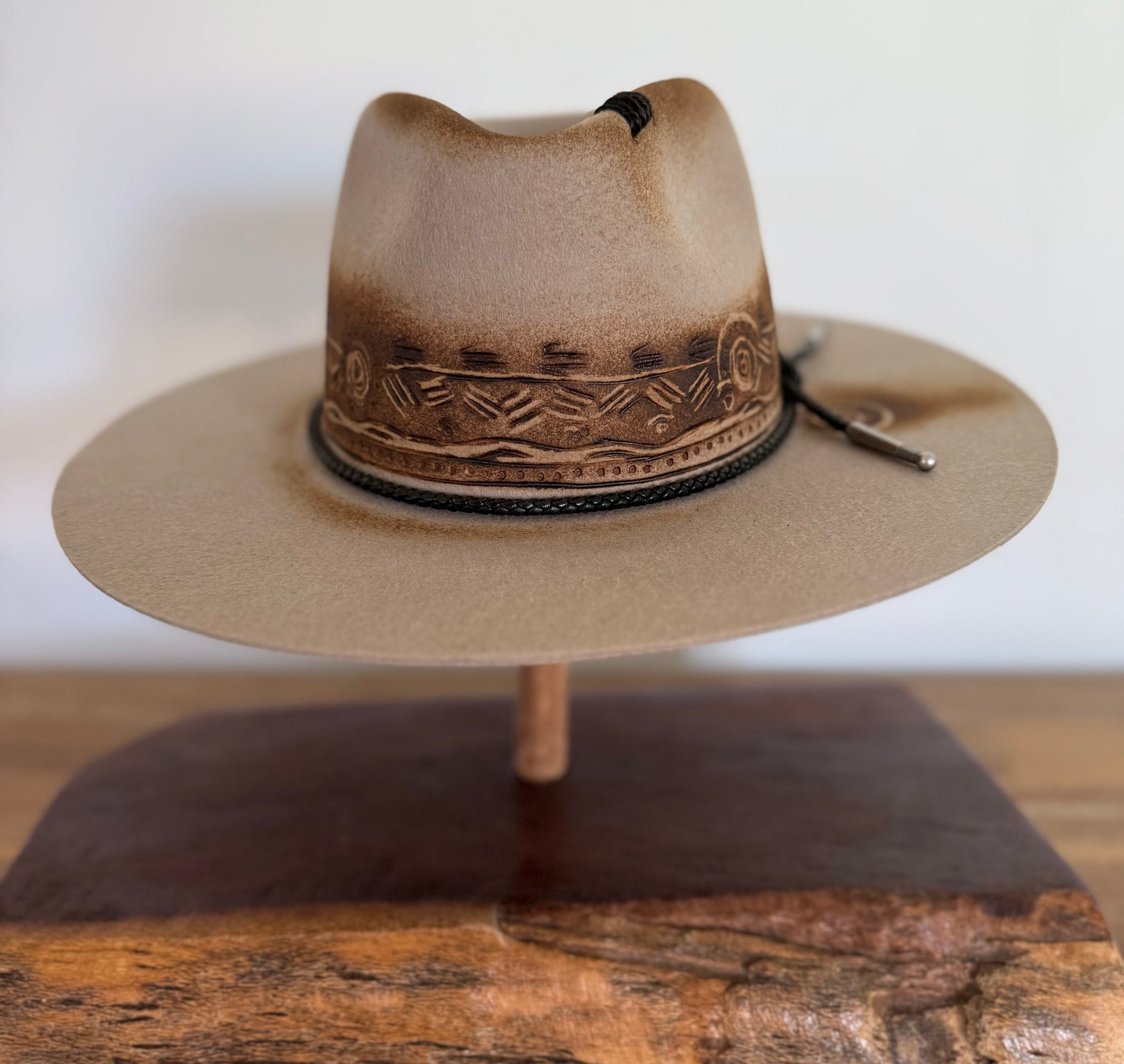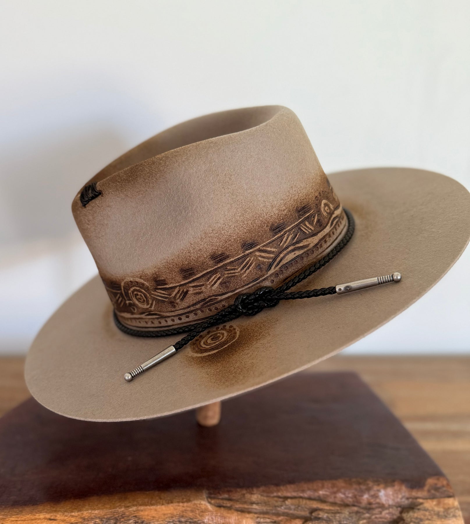with free hand burning, adding a distinctive